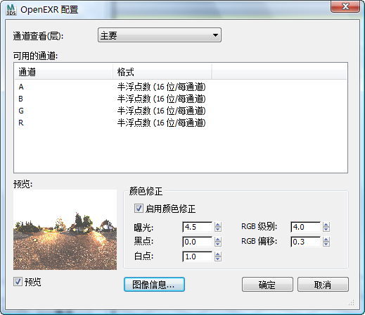 此版本的“OpenEXR 配置”对话框在打开 EXR 文件时就会出现。使用该对话框可选择要使用的层、应用颜色修正并预览图像。