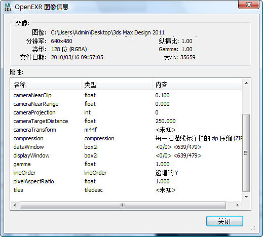- 单击该按钮可显示一个显示 EXR 文件相关信息的只读对话框。这些信息包括图像属性和可能已随该文件存储的元数据,如摄影机属性、分辨率等。