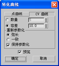 - 选择是转化为点曲线还是 CV 曲线。如果该曲线已经是选中的类型,则此对话框中的设置不能对其进行转化,但可以更改其属性。默认设置为 CV 曲线。