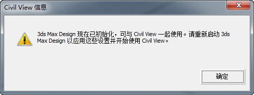 单击“确定”关闭警告,然后关闭并重新启动 3ds Max 以开始使用 Civil View 功能。
