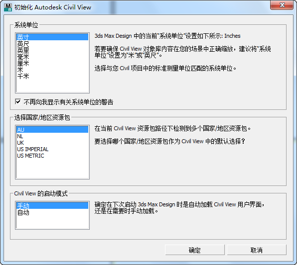 要使用 Civil View,必须将其初始化,然后重新启动 3ds Max。