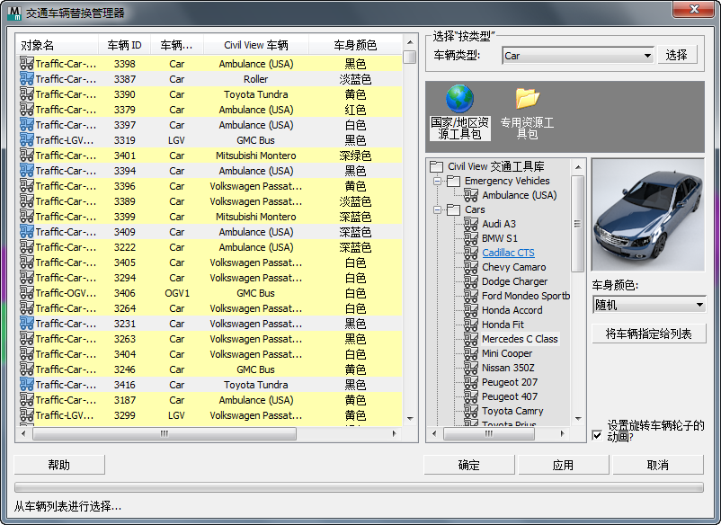 可以让您选择随机或单个 Civil View 车辆类型,以应用于车辆对象列表中的选定条目。