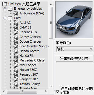 使用此面板可以决定将标准 Civil View 车辆库中的哪些车辆网格指定给当前从主车辆对象列表中选择的车辆。要将车辆库定义指定给选定的车辆对象,请执行以下两种操作之一:
