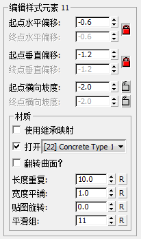 [锁定起点/终点横向坡度]单击可锁定或解除锁定“起点”和“终点”值。锁定“起点横向坡度”或“终点横向坡度”值后,更改垂直偏移不会影响该值;反之,会影响该值。默认设置为解除锁定。 启用此选项将禁用“材质”组(平滑组除外)中的其他设置。