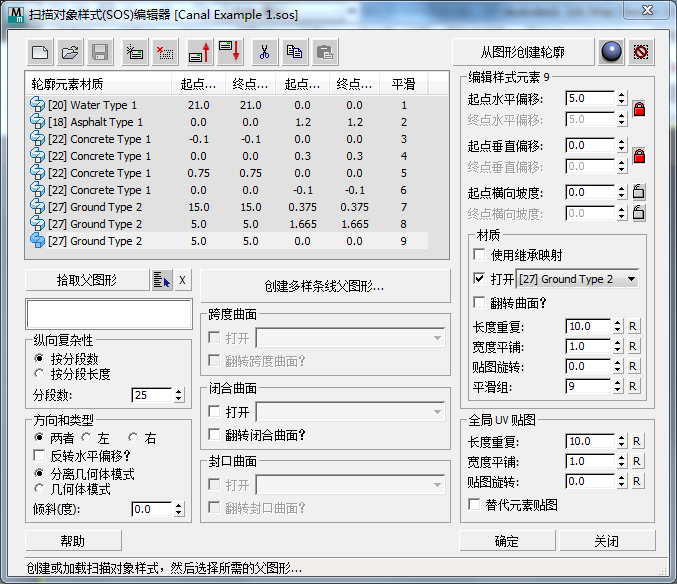 扫描对象定义可以保存到基于文本的扫描对象样式 (SOS)。每个样式都包含一组元素。每个元素都表示扫描对象内的一个曲面。每个元素包括可调整(和可变)的水平和垂直偏移以及独立的材质通道定义。默认情况下,扫描对象使用 CivilViewSurfaces 材质。