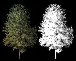 Civil View 中的树对象是通过将两个位图投影到平坦矩形平面上来创建的。第一个位图(即漫反射贴图)向树对象提供自然颜色。第二个位图是不透明贴图,定义矩形平面的哪些部分可以看到以及哪些区域是透明的。在白色区域中,可以隐约显示漫反射贴图。在黑色区域中,对象显示为透明。