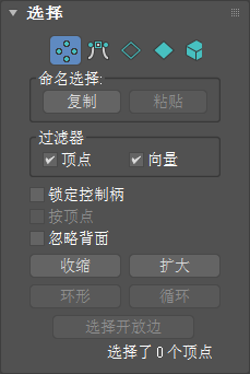 “选择”卷展栏提供了各种按钮,用于选择子对象层级和使用命名的选择以及显示和过滤器设置,还显示了与选定实体有关的信息。