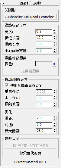 提示: 道路标记优化的默认 Civil View 设置(“间距”、“阈值”和“最大距离”)存储在 civilview.ini 主文件中。此文件保存在 /plugcfg 文件夹(3ds Max 所使用的每一种语言都具有此文件夹的一个副本)中。您可以编辑 INI 文件(如果需要)。