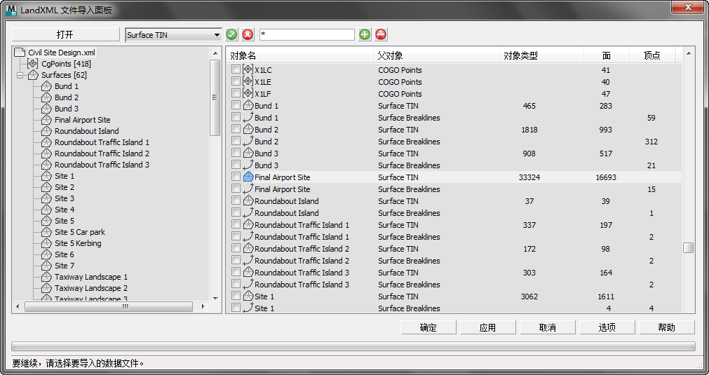所有其他 LandXML 对象类型都将忽略。