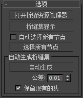 无论何时选择顶点或边,都可以将其保存为折缝集。此卷展栏提供控件,用于管理折缝集和调整值。