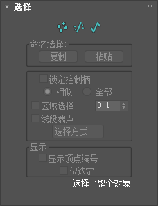 “选择”卷展栏底部是一个文本显示,提供有关当前选择的信息。如果选择了 0 个或更多子对象,文本将显示所选对象的编号。