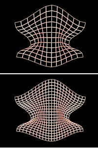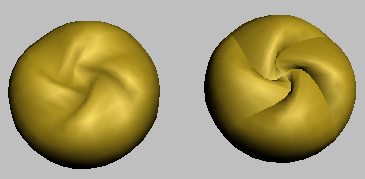 在下图中,可以将球体转化成“可编辑面片”格式,然后向中心处移动顶点,并使其旋转。此时,左侧的球体已经禁用“使用真面片法线”,而右侧的球体已经启用该选项。在这两种情况下,“视图步数”均设置为 8。