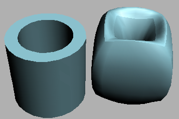 平滑之前的面片管(左侧)和使用“面片平滑”之后的面片管(右侧)
