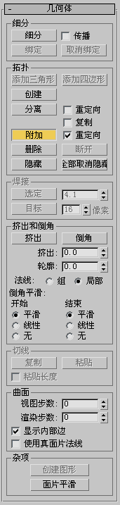 面片对象的“几何体”卷展栏包含用于在“对象”(最高)层级或某一个子对象层级更改面片几何体的大多数控件。