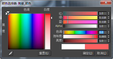 设置颜色的纯度或强度。饱和度接近 0 的弱色,看起来阴暗并且为灰色。饱和度为 255 的强色则非常亮并且纯正。