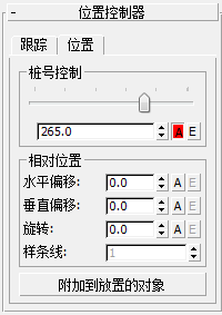 - 控制对象沿父图形的纵向位置。可使用滑块控制位置的粗糙更改,使用微调器进行更精细的调整。
