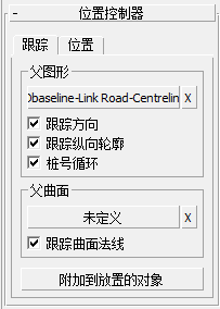 若要使用此选项,请单击此按钮,然后拾取想要将当前对象附加至其上的新父对象。然后,“Civil View 浏览器”面板中的“位置控制器”卷展栏将被替换为“附着控制器”卷展栏,该卷展栏具有使新附加的对象从其新父对象进行局部偏移的功能。