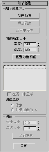在对象被复杂程度较低的对象代替前,设置该对象的最小大小,在对象被复杂程度较高的对象代替前,设置该对象的最大大小。值会根据当前“阈值单位”的类型改变。默认阈值被初始化,以便最复杂对象的图像输出大小是 100%。使用算法设置其余的阈值,该算法基于每个对象面的比。假定所有的面尺寸相同,然后拾取阈值,这样可以使这些面显示在屏幕上时大小保持恒定。通常,这将提供所需平滑变换的类型,但是可以自定义阈值。阈值在对象之间交互关联,例如,改变一个对象的最小大小将会改变下一个对象的最大大小。