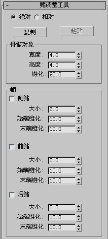 使用复选框切换骨骼相应一侧的鳍,使用数值设置控制鳍的大小和锥化设置。