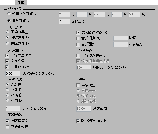 这些设置类似于“ProOptimizer”修改器中的设置。主要差别在于可以选择生成多个文件,且每个文件具有不同的优化级别。