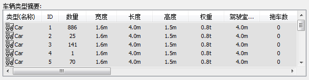 列出在 SIM 文件中找到的车辆类型以及在每个车辆类型类别中找到的车辆总数(数量)。