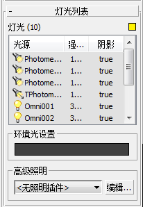 列表上方的标签会显示场景中有多少非日光光源,色样会显示光源对象的线框颜色。