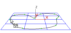 通过单击定位点之后,将在视口的 Z 向维度中投射单击。也就是说,单击经过投射后“穿过屏幕”,进入曲面。如果曲线所属曲面的一部分在视口中清晰可见,则这是在曲面上创建曲线最直接的方式。然而,使用这种方法不能在视口中不可见的曲面位置上(这些位置可能是背面、其他几何体的后面等等)放置点。
