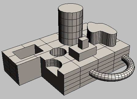 ProBoolean、ProCutter 和四边形网格化修改器可以使用四边形网格算法重设平面曲面的网格。将该能力与“网格平滑”、“涡轮平滑”和“可编辑多边形”中的细分曲面工具结合使用可以产生动态效果。