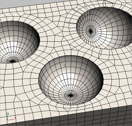 下图显示了从长方体中减去三个相同大小的球体的效果。正确对齐左侧球体,以便沿着两个边界都有出色的四边形。这将在平滑时产生不错的效果。提升中间球体,这样在边界附近就会有一个很细的四边形条带。这会沿该边产生很小的平滑效果,您可以在渲染图像中看到这一情况。右侧球体发生旋转,从而使对齐效果不好,并且在球体上出现许多三角形,在长方体平面上出现小的四边形。您可以在渲染的图像中看到不希望的效果。
