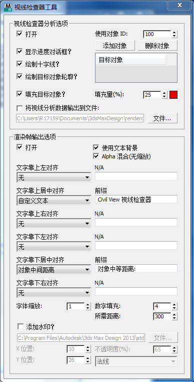 “视线检查器”可设置公路上视线的简单目视检查。在动画的每个帧都渲染完后,通过追踪并分析从当前视点到一个或多个目标对象的位置和距离,可以实现此检查。报告的所有距离都使用直线距离计算。