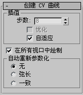 使用该组框中的控件,可以指定自动重新参数化。这些控件与“重新参数化”对话框中的控件类似。此外,除“无”之外的所有选项都可以指示 3ds Max 对曲线进行自动重新参数化,即,无论何时通过移动 CV 和细化等操作进行编辑,都可以。