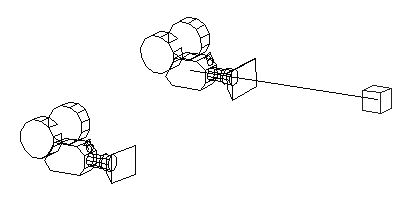 目标摄影机创建一个双图标,用于表示摄影机(与蓝色三角形相交的蓝色框)和摄影机目标(蓝色框)。自由摄影机创建单个图标,表示摄影机及其视野。