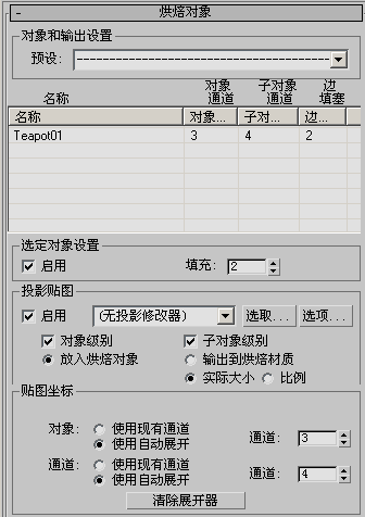 “投影贴图”组中的“对象层级”和“子对象层级”单选按钮,以及“要烘培的对象”卷展栏