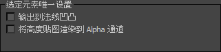 - 启用该选项之后,可以渲染灰度高度贴图,并将其指定给法线贴图的 alpha 通道。如果对没有 alpha 通道的文件类型进行渲染,则此设置不生效。默认设置为禁用状态。