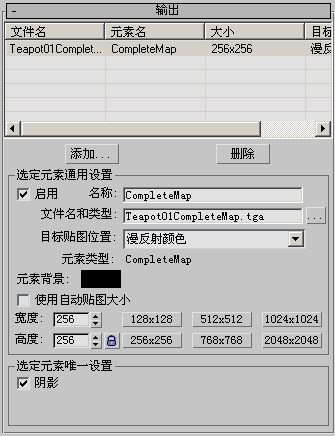 注: “文件名”和“类型”设置只指定选定元素的路径和文件名。要设置将存储所有烘焙纹理的文件夹,请在“常规设置”卷展栏上的“输出”组中设置路径。