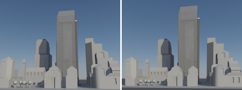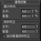这些设置将沿水平或垂直方向倾斜摄影机。您可以使用它们来更正透视,特别是在摄影机已向上或向下倾斜的场景中。