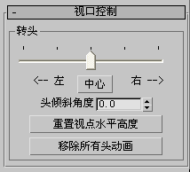 注: “转动头部”和“头部倾斜角度”控件使用 Bezier 控制器来旋转穿行的摄影机。如果您创建的关键点太多,或它们靠得太紧,可能会得到意外结果。为实现最佳效果,请从起始位置开始移动,然后添加关键点直至结束,并尽可能少地创建关键点。