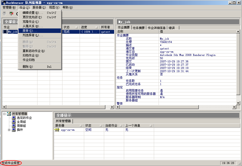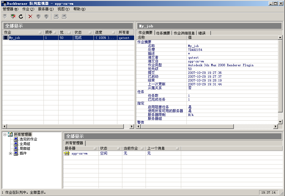 用于获取渲染作业的信息。只有作业列表中至少有一个作业高亮显示,“作业”菜单中的大部分功能才可用,并且很多功能要求只有在仅有一个作业高亮显示时才可用。