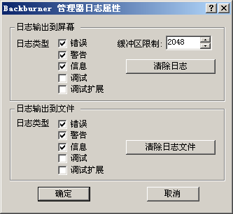 警告: 只有当单击“清除日志文件”按钮时日志文件才能被清除。当类别用于其中一个或两个日志文件后,每次渲染时该文件都会继续增加大小。