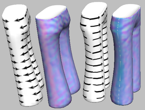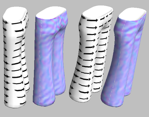 对法线凹凸贴图使用切线空间时,通常在硬件明暗器、渲染器和第三方应用程序之间用于切线的值是一致的。但是,有时,几何体的各个部分会相对于彼此翻转,导致在渲染或使用硬件明暗器时出现不连续性。切线空间是法线凹凸贴图的默认选项,并且是应当用于既移动又变形的对象(如已设置动画的角色)的方法。使用其他坐标空间时不会出现此问题:世界、屏幕或局部。