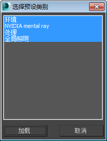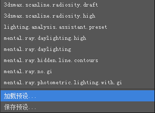 每一种类别对应“渲染设置”对话框的一个面板。从 RPS 文件中选择要加载的面板设置,然后单击“加载”。加载自定义预设文件之后,其名称与默认的选项一起显示在下拉列表中。