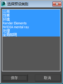 每一种类别对应“渲染设置”对话框的一个面板。选择要保存的面板设置,然后单击“保存”。保存自定义预设文件之后,其名称与默认的选项一起显示在下拉列表中。