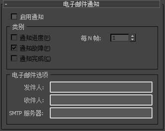 使用此卷展栏可使渲染作业发送电子邮件通知,如网络渲染那样。如果启动冗长的渲染(如动画),并且不需要在系统上花费所有时间,这种通知非常有用。