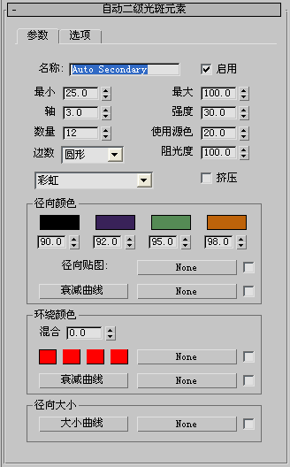 确定围绕特定镜头效果的径向大小。单击“大小曲线”按钮将显示“径向大小”对话框。使用“径向大小”对话框可以在线上创建点,然后将这些点沿着图形移动,确定效果应放在灯光或对象周围的哪个位置。也可以使用贴图确定效果应放在哪个位置。使用复选框激活贴图。