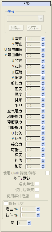 将布料属性参数保存为文件,以便此后加载。默认情况下,布料预设文件将保存到 3ds Max 安装目录内的 \cloth 文件夹。