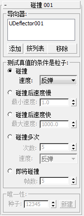 与一个或多个指定的导向板空间扭曲碰撞的粒子的碰撞测试。还可以测试在一次或多次碰撞后,粒子速度减慢还是加快,粒子是否已碰撞多次,甚至粒子是否在指定的帧数后将与某个导向板碰撞。