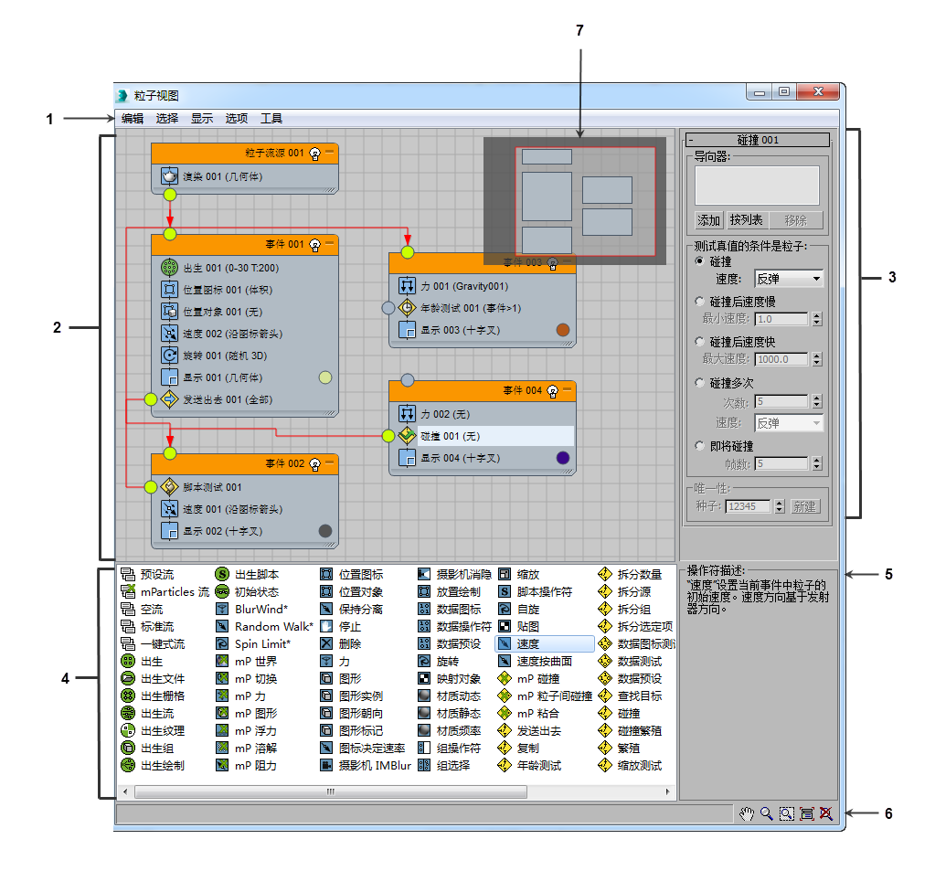 “粒子视图”提供了用于创建和修改“粒子流”中的粒子系统的主用户界面。主窗口(即事件显示)包含描述粒子系统的粒子图表。粒子系统包含一个或多个相互关联的事件,每个事件包含一个具有一个或多个 操作符 和 测试 的列表。操作符和测试统称为动作。