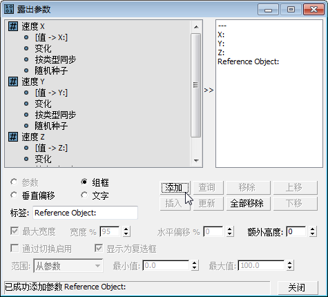 4. 还可添加“茶壶 001”“对象”,将其标记为“参考对象:”。将“宽度”设置为最大值 95,以便有足够的空间容纳卷展栏上的按钮和标签。然后选择“组框”。最后,单击“添加”。
