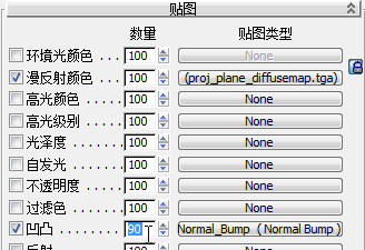 - 在“参数编辑器”面板上,打开“贴图”卷展栏,将凹凸量增至 90。