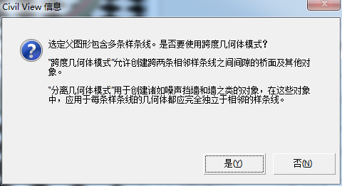 之所以显示此对话框,是因为图形对象包含多条样条线。在这种情况下,“扫描对象样式编辑器”可以通过两种方法中的一种解释每条样条线的用途。若要生成诸如桥面、隧道衬砌等对象,则需要“可跨越几何体模式”:此模式假定每个样条线表示路的任一侧,跨度曲面和闭合曲面可以生成跨样条线之间的间隙的“链接”曲面。另一种模式“分离几何体模式”更适合于创建噪声挡墙和挡土墙:对于这些类型的特征,扫描对象的几何体会分别应用到图形中的每条样条线。